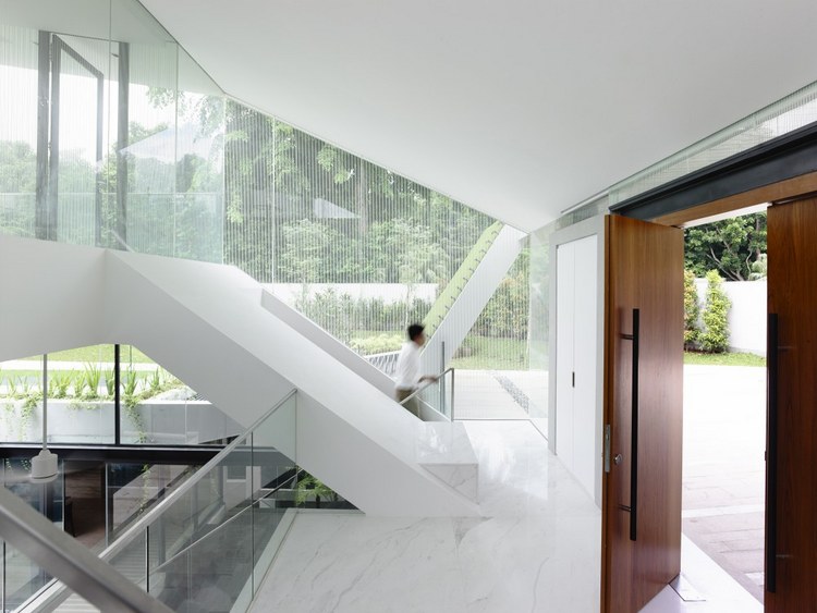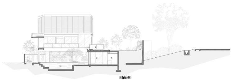 別墅設計安德魯路私人別墅(Andrew Road)設計師將與街面水平的這一層打造為封閉式的樣式,從入口處可以看到中央院落巨大的游泳池,四面各功能房采用了透明玻璃設計,高于街面水平層的二三層樓的屋頂略大于房屋,如鍋蓋一樣將房屋罩在下面。長條式的格柵落地玻璃窗設計與其他部分的設計相呼應,體現(xiàn)了整個別墅簡明的風格樣式。D字型的內(nèi)部空間設計將房間主要設置在半弧形的位置,過道和樓梯則位于D字形垂直的豎向位置,起到了隔離噪音等作用。
