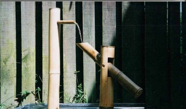 日本庭院中一竹制小品名“逐鹿”,利用杠桿原理,當(dāng)竹筒上部注滿水后,自然下垂倒空筒中水,而后再翹頭,回復(fù)原來的平衡,尾部擊打在撞石上,發(fā)出清脆聲響,頗為有趣。