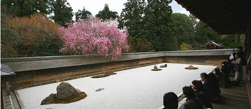 后來,這種庭院發(fā)展臻于極致——喬灌木、小橋、島嶼甚至庭院不可缺少的水體等造園慣用要素均被一一剔除,僅留下巖石、耙制的沙礫和自發(fā)生長(zhǎng)與蔭蔽處的一塊塊苔地。